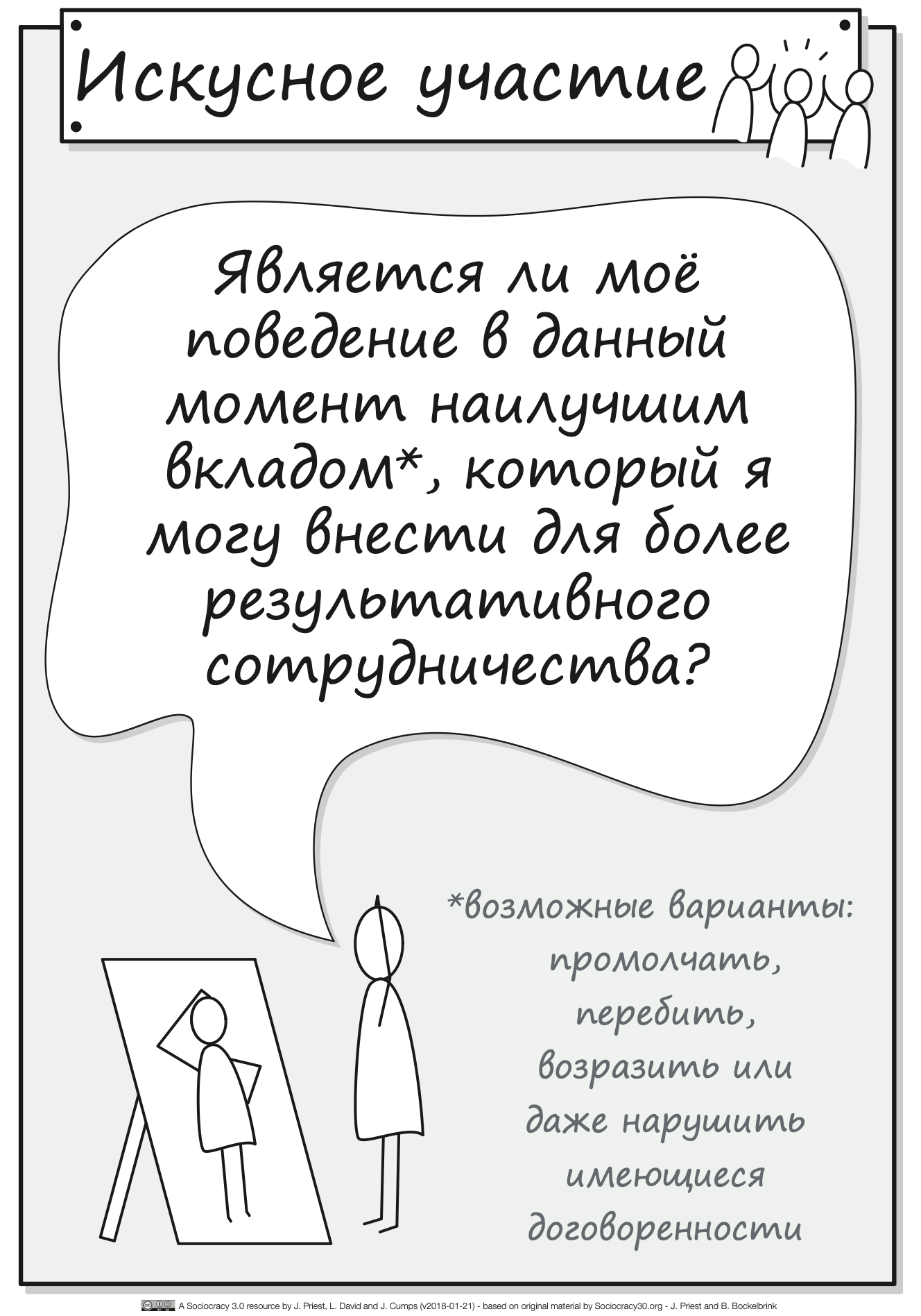 Искусное участие — это личное обязательство активно рефлексировать над своими действиями и доводить принятые договоренности до конца, делая это наилучшим возможным образом в данных обстоятельствах. Оно предполагает: